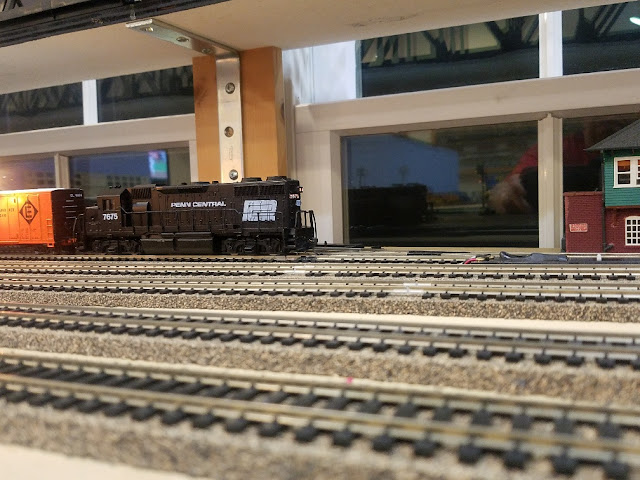The facility can handle a couple dozen cars at a time, with 2 inbound tracks, two outbound tracks, and 2 building tracks. There's one more track that's reserved for their switcher. However, for today's move, PC 7675 will do the chores as Tropicana switcher #24 is being serviced.