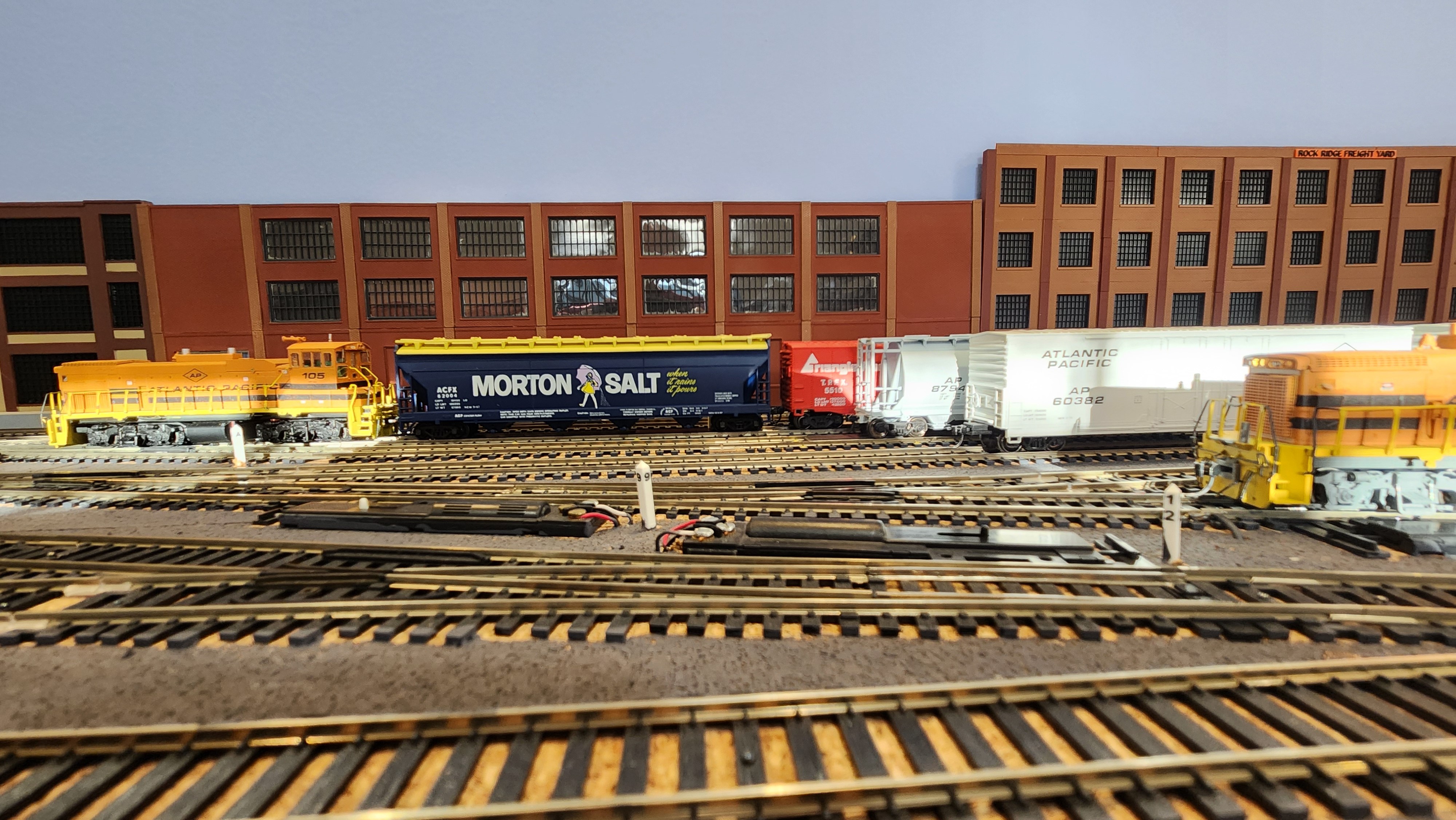 AP SW1500 with JP in the cab has brought over 3 covered hoppers from Cargill. JP pulled the Morton Salt hopper car from the Morton Salt and dropped on track 6...